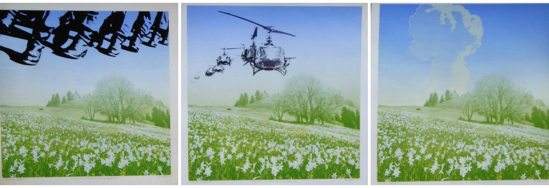 Per Kleivas ” Tre blad frå imperialismens dagbok I, II og III” ble laget i 1971 som en protest mot Vietnamkrigen. Silketrykket med amerikanske helikoptre som flyr lavt over en brennende vietnamesisk jord er ikonisk. Så ble det altså utstilt i Krakow i 1972, og er tydeligvis ikke glemt ennå.