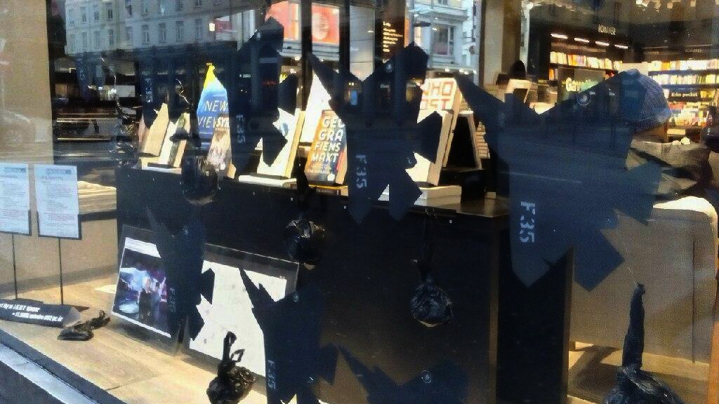 Internasjonal kvinneliga for fred og frihet (IKFF) har et aktivt lokallag i Bergen. I anledning Klimafestivalen § 112 har de fått på plass en vindusutstilling hos Norli i Strandgaten. Utstillingen er et lite bidrag for å skape oppmerksomhet rundt F-35 flyenes betydning for klimaregnskapet.