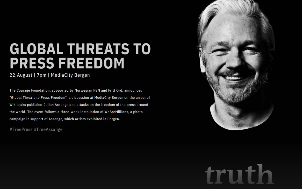 Torsdag 22. august kl. 19.00 på Media City Bergen – «Global Threats to Press Freedom» – debatt om arrestasjonen av WikiLeaks-utgiver Julian Assange og angrep på pressefriheten rundt om i verden. Arrangementet er en direkte oppfølging av utstillingen #WeAreMillions – en fotokampanje til støtte for Assange, som kunstnere stiller ut i Bergen.