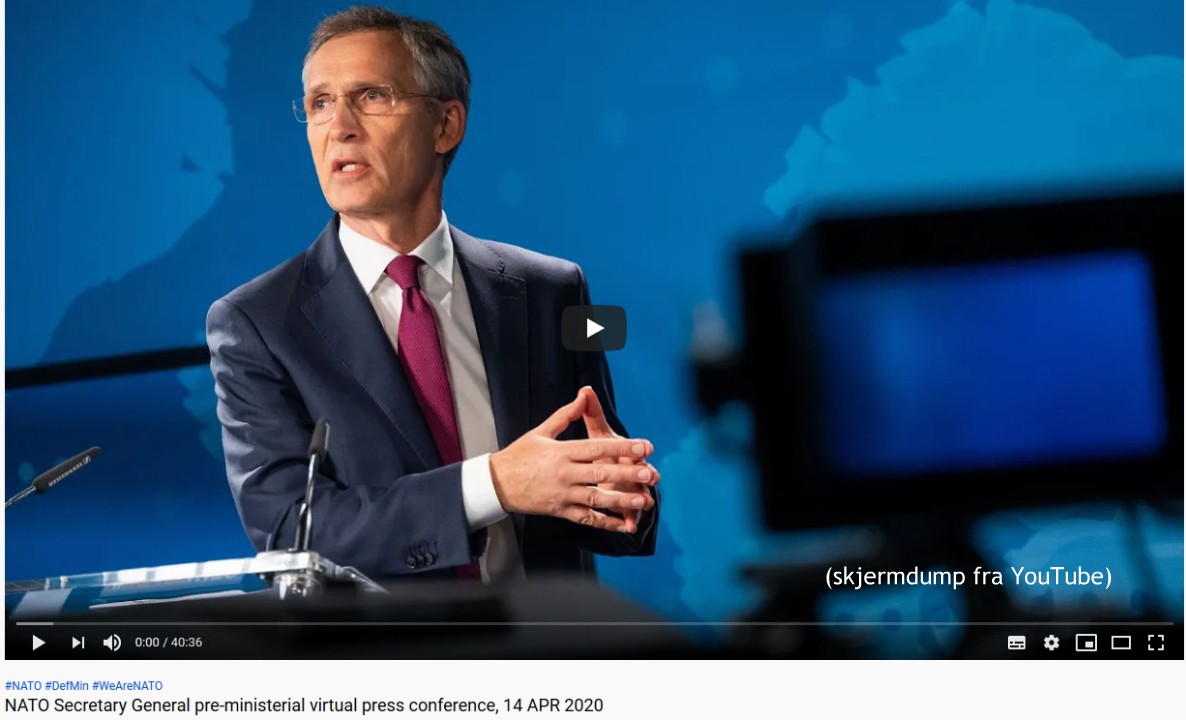 NATOs generalsekretær – Libyabomberen Jens Stoltenberg – holdt i går en online pressekonferanse, før alle forsvarsministrene i dag har et virtuelt møte. Her fikk han anledning til å markedsføre NATOs tiltak mot COVID-19.