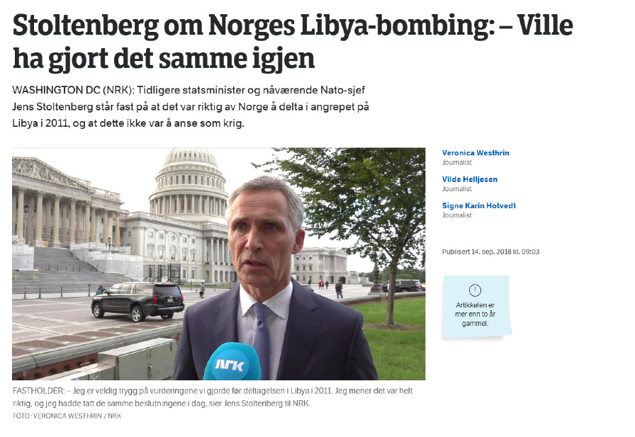 I 2018 sa Jens Stoltenberg til NRK Urix at han ville ha gjort det samme igjen! Det er nesten ikke til å tro. På dette tidspunkt var det nemlig for lengst avslørt at krigen ble startet på grunnlag av fabrikkerte løgner, noe bl.a. den britiske Underhus-komiteen avdekket i en grundig rapport i 2016.
