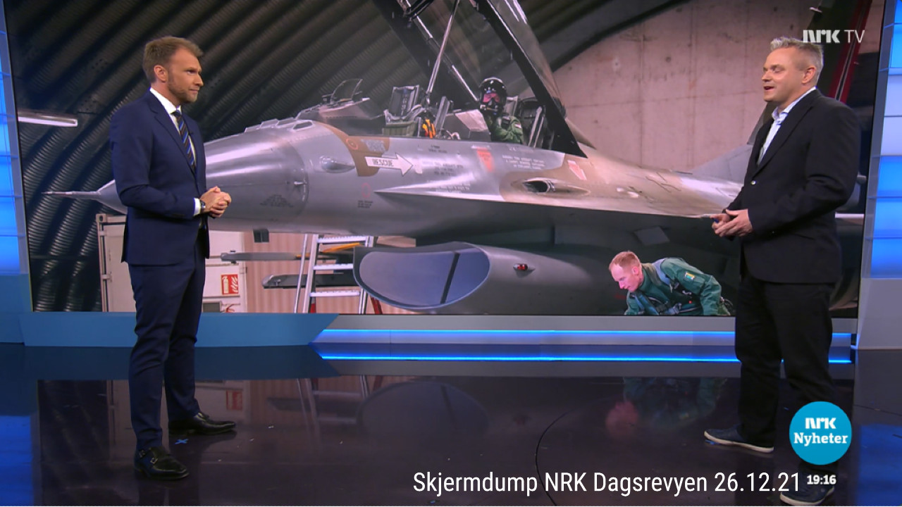 Et 40 år langt kapittel i norsk forsvarshistorie er snart over. Kampflyet F-16 fases ut til fordel for det nye F-35. 2. juledag brukte NRK Dagsrevyen (fra 14.53 – 21.47 i sendingen) like godt 7 minutter på å markere begivenheten. I innslaget ble «piloten» Eirik Veum introdusert av programlederen – «du er jo ikke pilot Eirik, men du fikk faktisk styre flyet?». Nei, Eirik Veum er ikke pilot. Han er NRK-journalisten som Luftforsvaret hadde invitert med på en siste flygning.