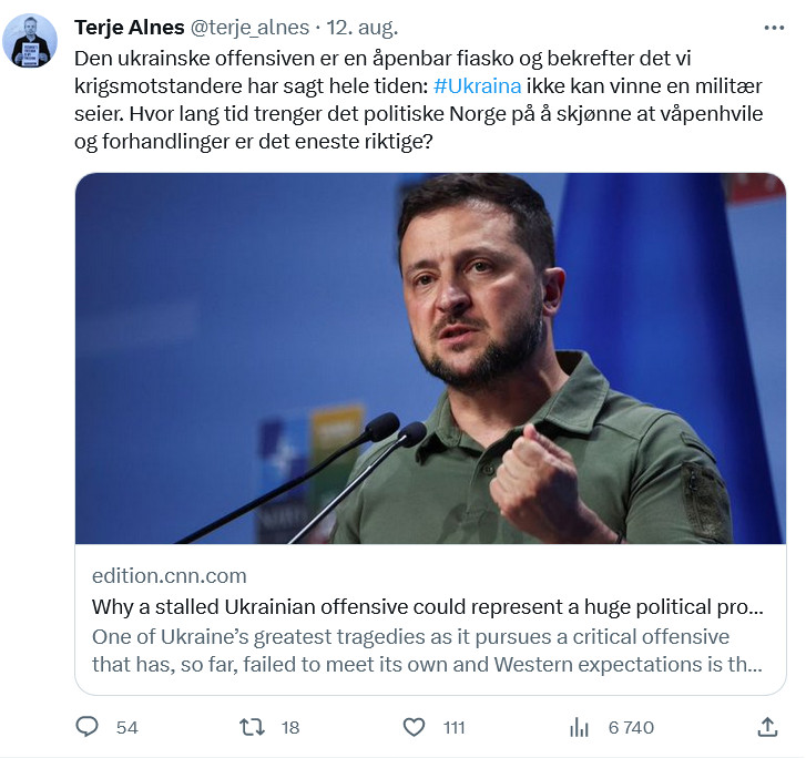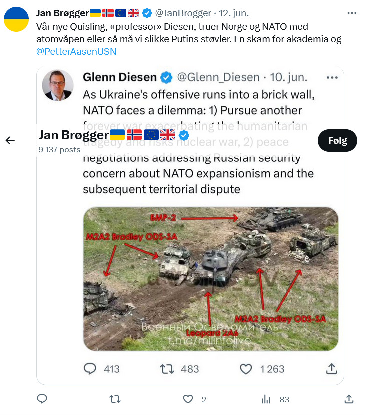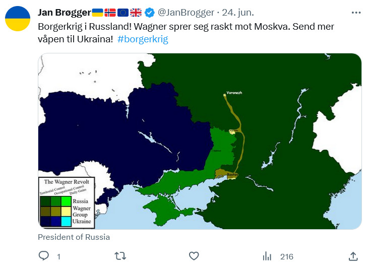 Tro om igjen. Brøgger krever mer våpen og mer krig, og det virker til og med som han ønsker at krigen skal spre seg til Russland. Slik kan vi tolke tweeten hans fra 24. juni, da Wagner-gruppen var på vei mot Moskva.