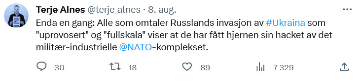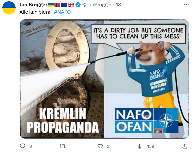 Brøgger ser åpenbart på seg selv som en informasjonskriger. Han kobler seg direkte opp mot det såkalte NAFO – The North Atlantic Fella Organization – en gruppe aktivister som ser det som sin oppgave å motvirke det de oppfatter som russisk propaganda og desinformasjon på internett.