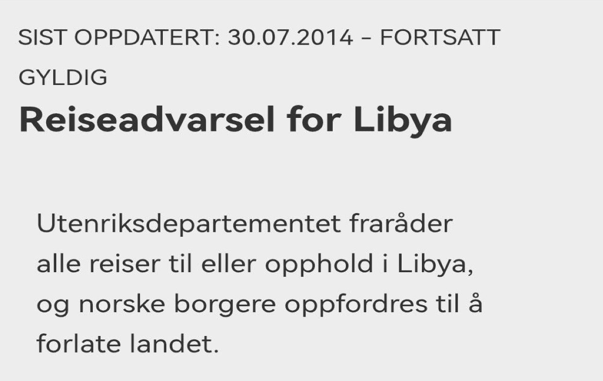 Reiseinformasjon Libya: Sikkerhetssituasjonen i Libya er farlig og uforutsigbar. UD fraråder alle reiser til og opphold i Libya.