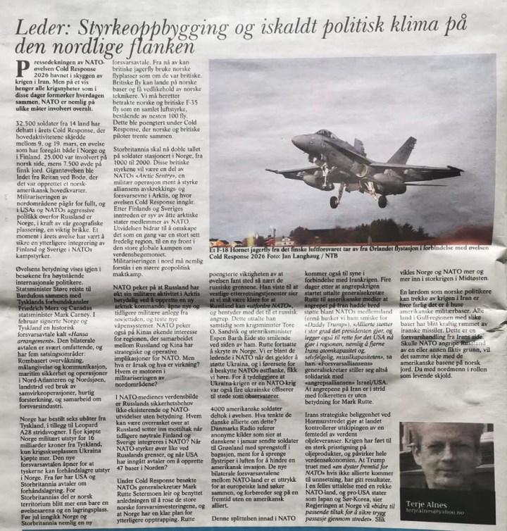 «Styrkeoppbygging og iskaldt politisk klima på den nordlige flanken» var lederartikkel i avisa Friheten nr. 7 2026 (26. mars 2026). Den ble publisert på Steigan.no 28. mars 2026, og på Derimot.no 30. mars 2026.