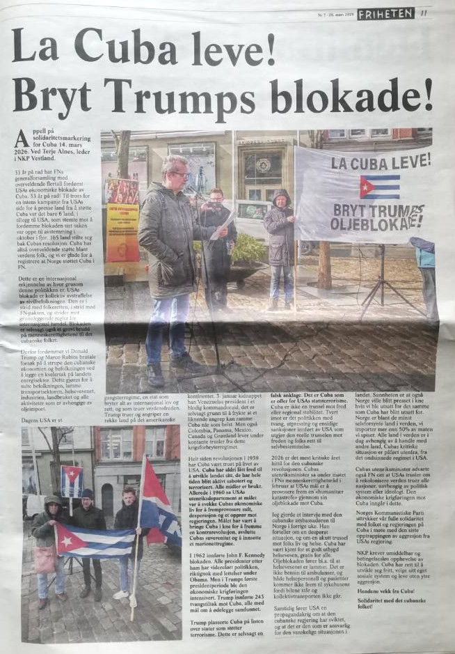 «La Cuba leve! Bryt Trumps oljeblokade!» ble lagt ut på Steigan.no 16. mars 2026, og på Derimot.no 18. mars 2026. Saken sto på trykk i Friheten nr. 7 2026 (26. mars 2026).